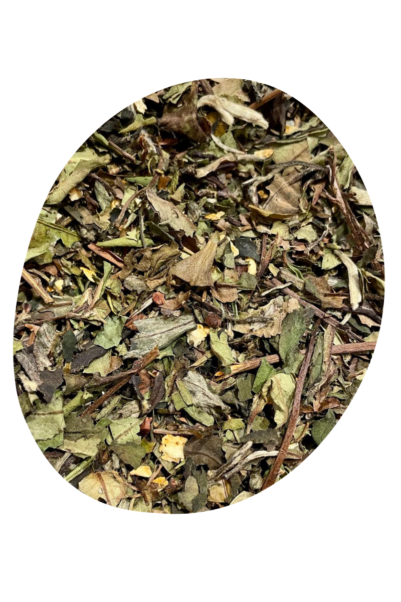 Ķīnas baltā tēja ar kakao pupiņām, apelsīna miziņām un kanēli.